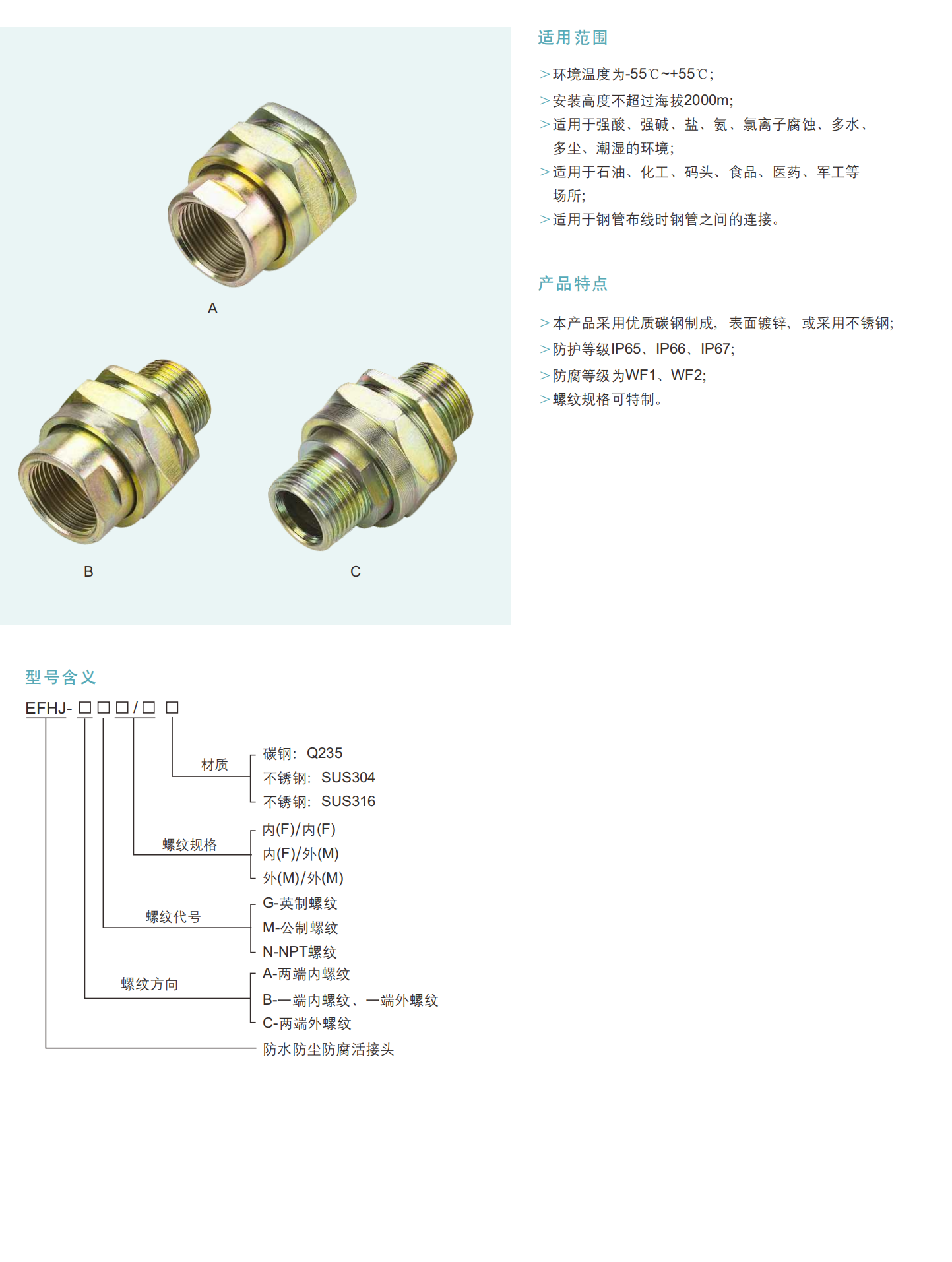 EFHJ防水、防尘、耐腐蚀活接头 (不锈钢、碳钢)