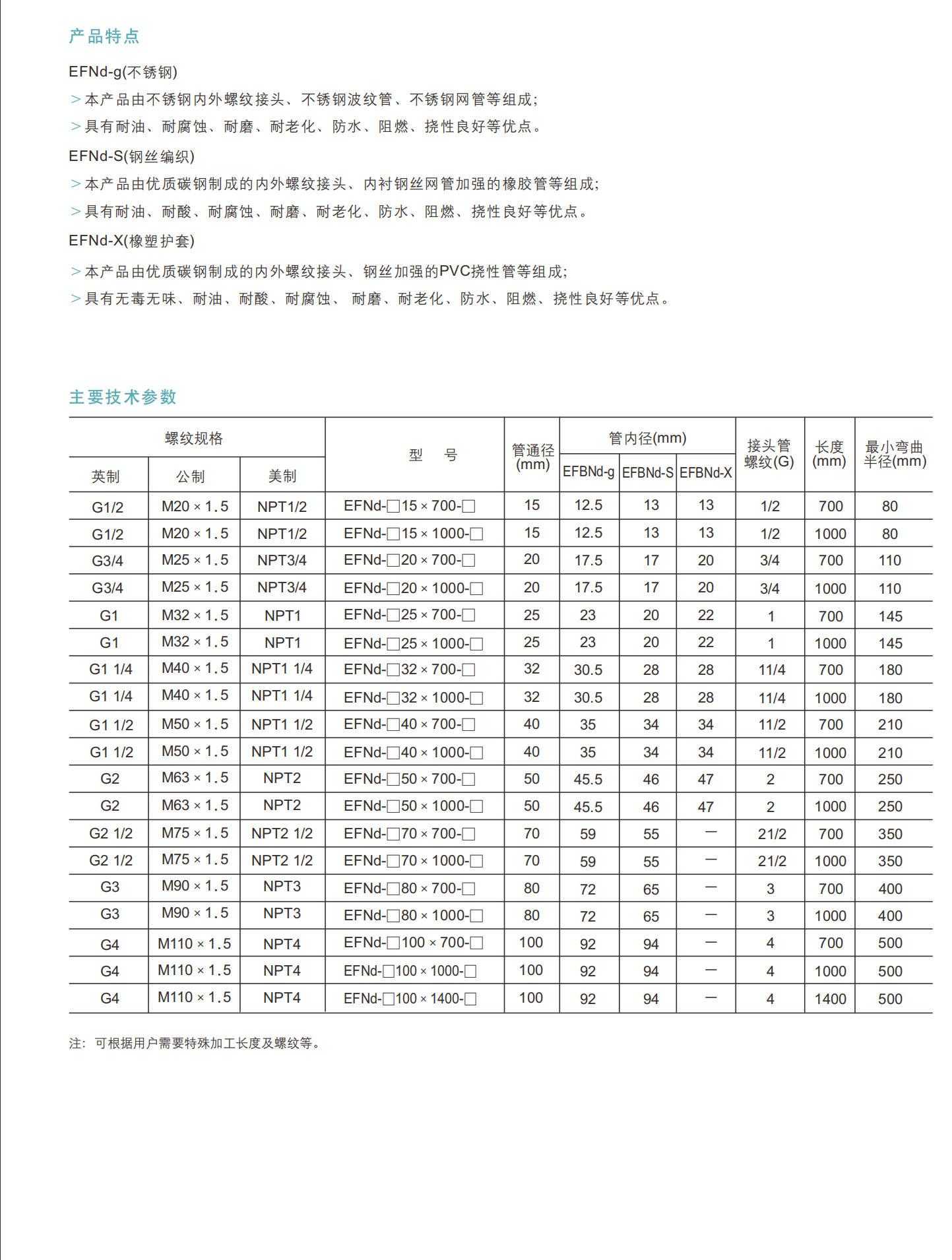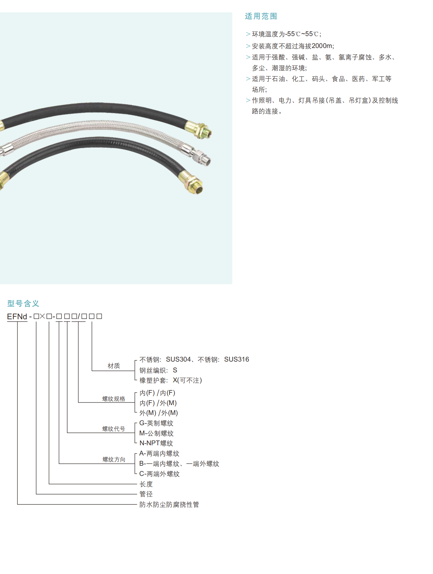 EFNd防水、防尘、耐腐蚀挠性连接管 (钢丝编织、不锈钢、橡胶/塑料护套)