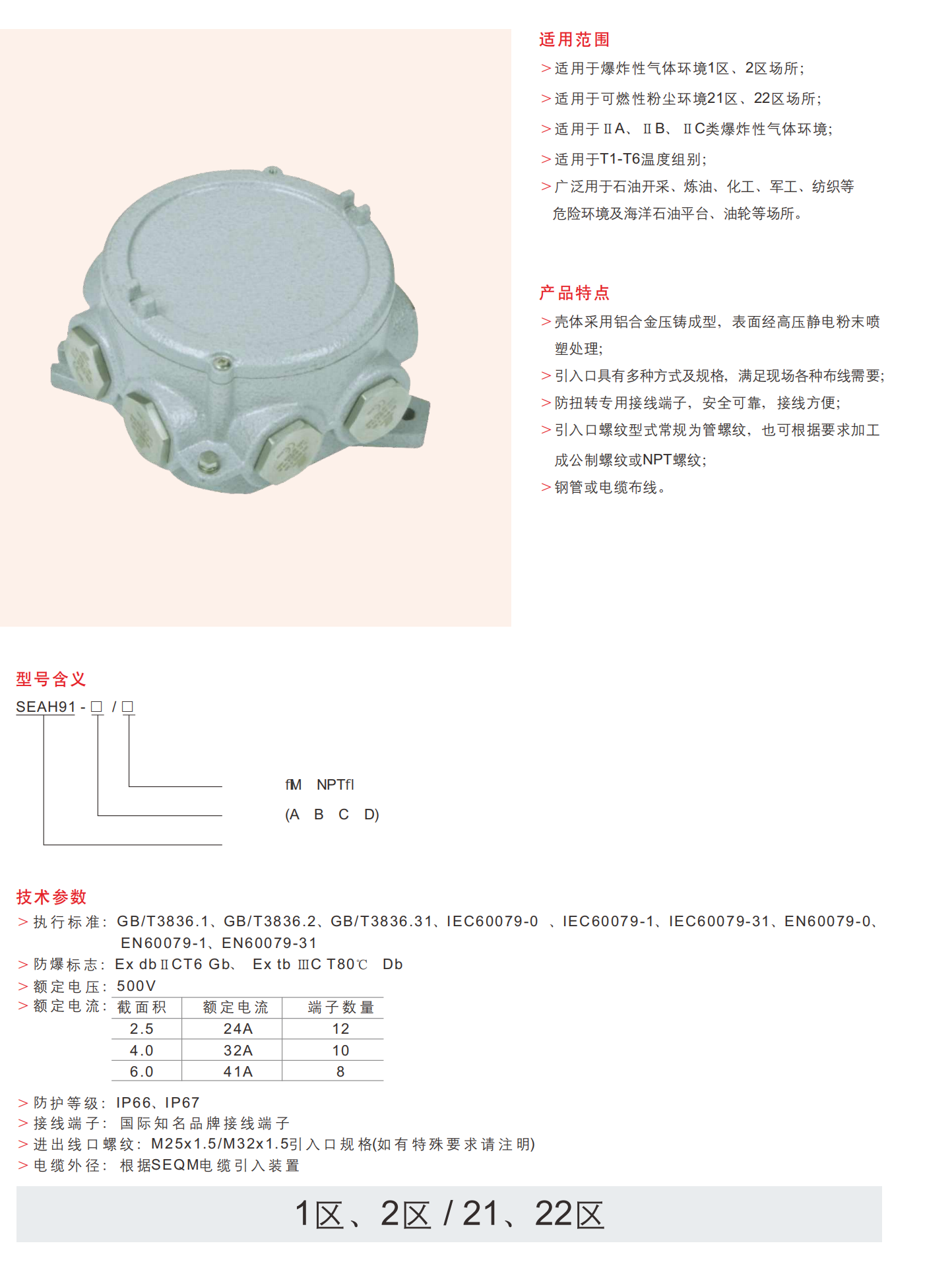 SEAH91系列专为1/2区气体和21/22区粉尘环境而设计,可确保炼油厂,海洋平台和纺织厂的安全电气连接。这些盒子采用带静电涂层的压铸铝外壳,支持大电流端子 (高达41A) 和IP67-rated保护。