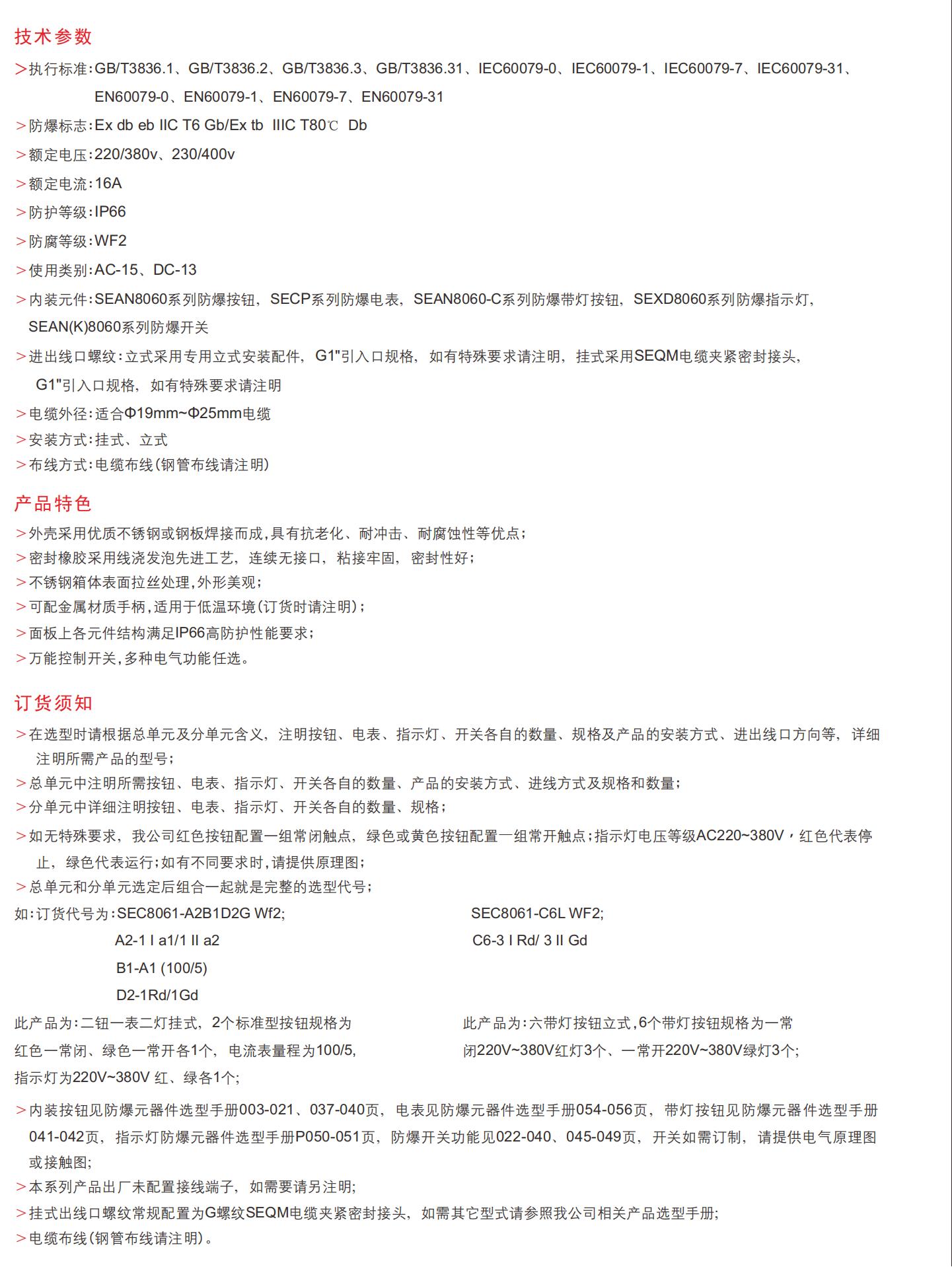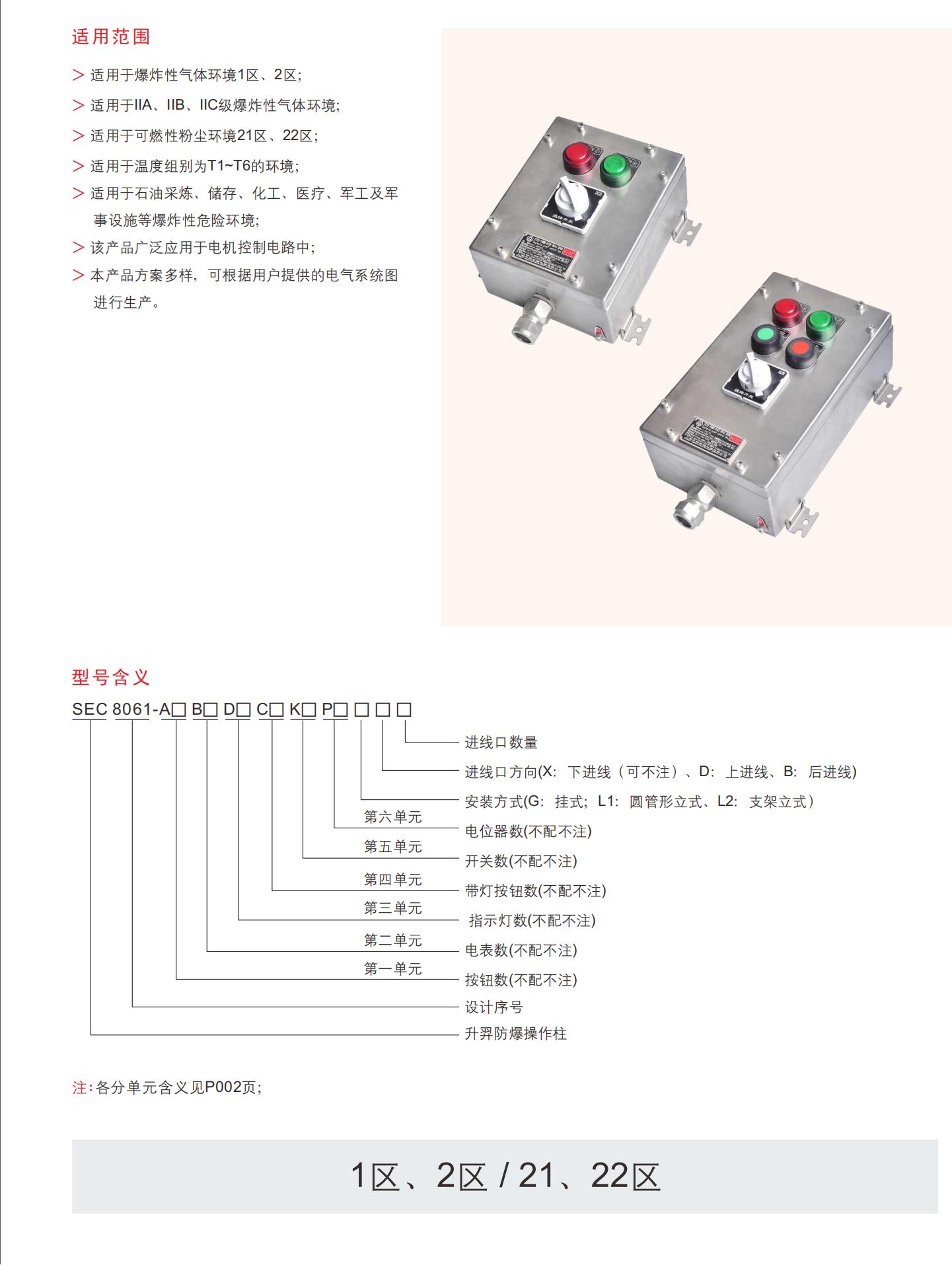 专为1/2区气体 (IIA,IIB,IIC) 和21/22区粉尘环境,SEC8061系列为炼油厂提供可定制的控制解决方案,化工厂,和军事设施。采用不锈钢或焊接钢外壳,具有WF2-rated的耐腐蚀性,其无缝硅胶密封接头确保IP66保护免受恶劣的元素。模块化设计通过用户定义的电气原理图支持灵活的配置 (按钮,仪表,指示器,开关)。通过Ex db eb IIC T6 Gb/Ex tb IIIC T80 °C Db (GB/T3836,IEC/EN60079) 认证,提供G1 “螺纹入口 (Φ19-25mm电缆) 和多安装选项 (墙,吊坠,垂直)。独特的抗老化涂层和通用开关兼容性 (AC-15/DC-13) 确保在极端温度下的耐用性 (T1-T6)