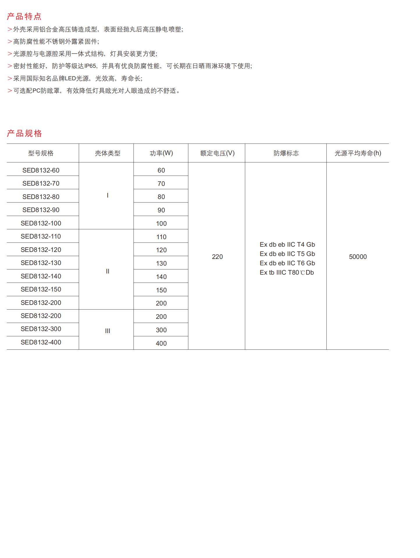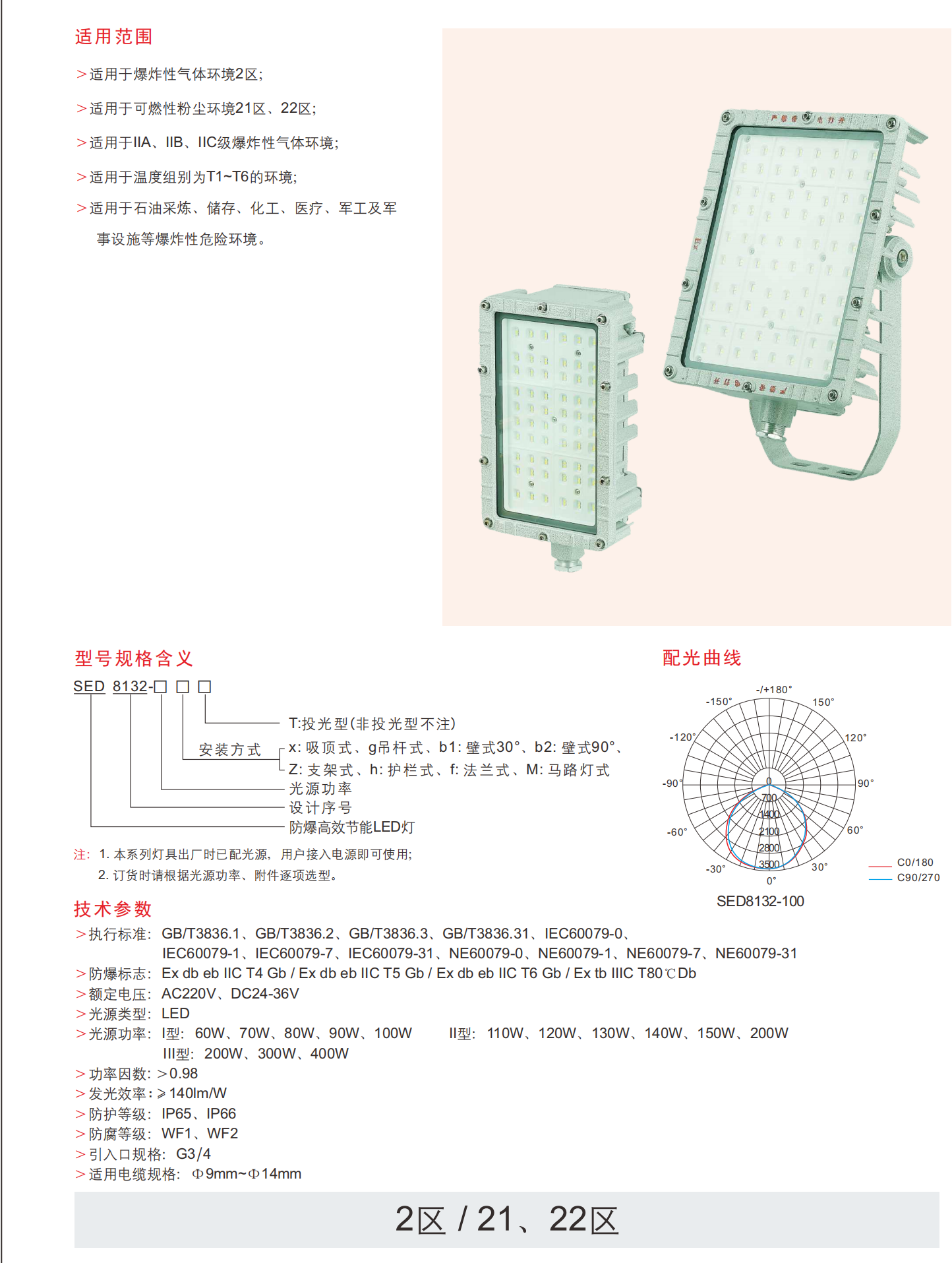 设计的危险区域 (2/21/22区,iia-iic,T1-T6),SED8132 led灯提供石油,化工,军事防爆照明,和工业设施。其压铸铝外壳采用不锈钢紧固件和IP65/66等级密封,可确保在恶劣条件下的耐腐蚀性 (WF1/WF2)。采用统一光源/电源腔设计,可简化跨多个安装选项 (天花板、墙壁、支架或导管) 的安装。该系列提供60W-400W功率变体,具有 ≥ 140 lm/W的功效,220v/DC兼容性和50,000小时的寿命。通过GB/T、IEC和EN标准认证 (Ex nR CT5 Gc / Ex tb IIIC T95 °C Db),它集成了高性能led与可选的防眩光PC盖视觉舒适。模块化配置支持灵活的升级,而强化的热管理可确保稳定性。理想的爆炸性气体/粉尘环境需要免维护,节能解决方案。