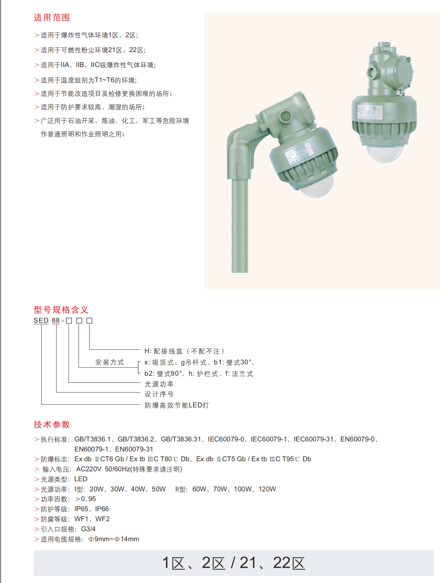 SED88系列提供认证的防爆照明1/2区气体和21/22区粉尘环境。具有高压静电涂层和不锈钢紧固件压铸铝外壳,耐腐蚀和冲击。配备高亮度COB集成led (>140 lm/W),它通过钢化硼硅玻璃提供均匀,无眩光的照明。其纯防爆设计包括分离的光源,电源,和布线室,以提高安全性。支持灵活的安装 (天花板,墙壁,法兰),并提供IP66/WF2保护,G3/4管道布线,和隔热。通过Ex db II CT6 Gb/Ex tb III C T80 °C Db (GB/IEC/EN标准) 认证,适用于石油,化工,煤炭和铁路行业。型号范围从20w到120w,使用寿命为50,000小时。