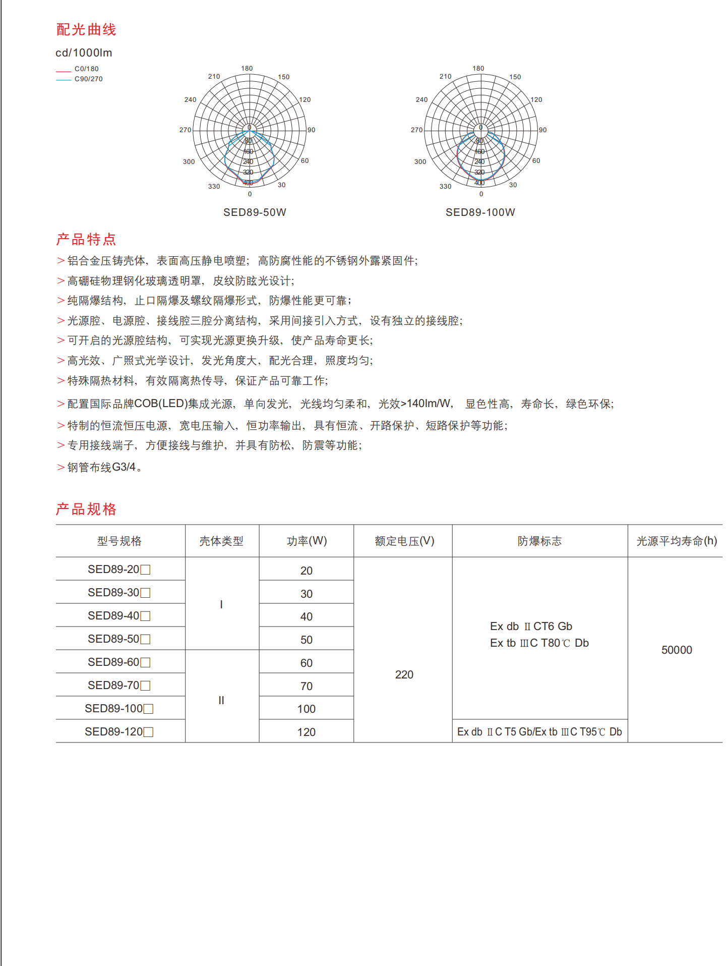 SED89系列提供认证的防爆照明危险气体 (区域1/2) 和可燃粉尘环境 (区域21/22)。采用压铸铝外壳,高硼硅钢化玻璃镜片和不锈钢紧固件制成,可确保耐腐蚀性和耐冲击性。具有分离的光源,电源纯防爆结构,布线室,它提高了IIA/IIC气体环境的安全性。高效COB led (>140 lm/W) 可提供均匀的光分布,而可更换模块的使用寿命可延长至50,000小时。通过Ex db/Ex tb标准 (IEC/GB/EN) 和IP66/WF2等级认证,它支持灵活的安装 (天花板,吊坠,墙壁),石油,化工,和军事工业。包括热绝缘,短路保护,和G3/4导管接线。