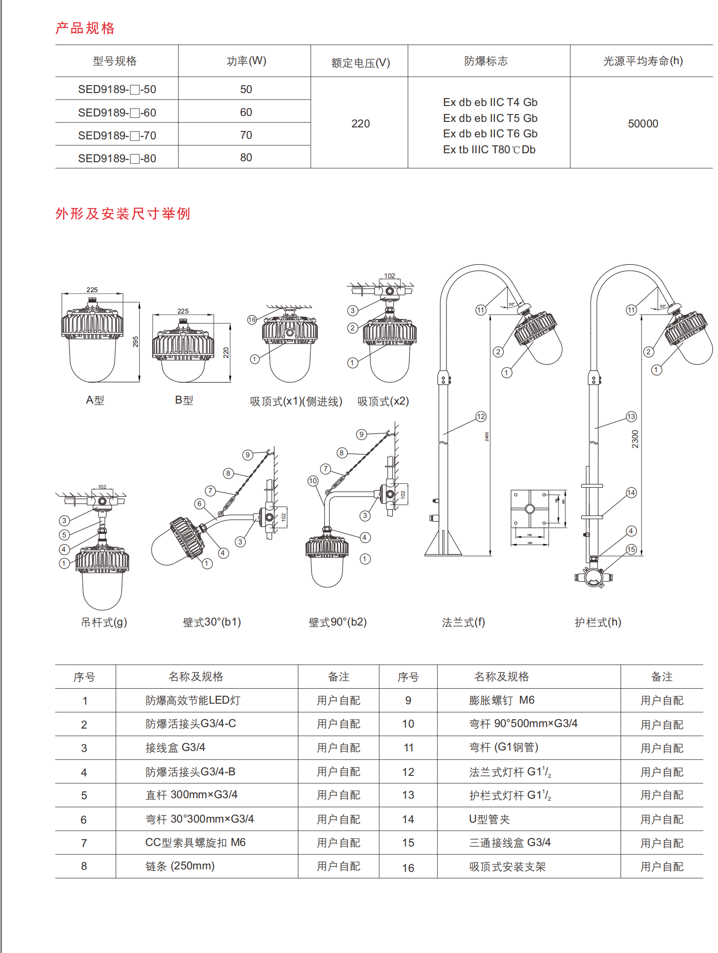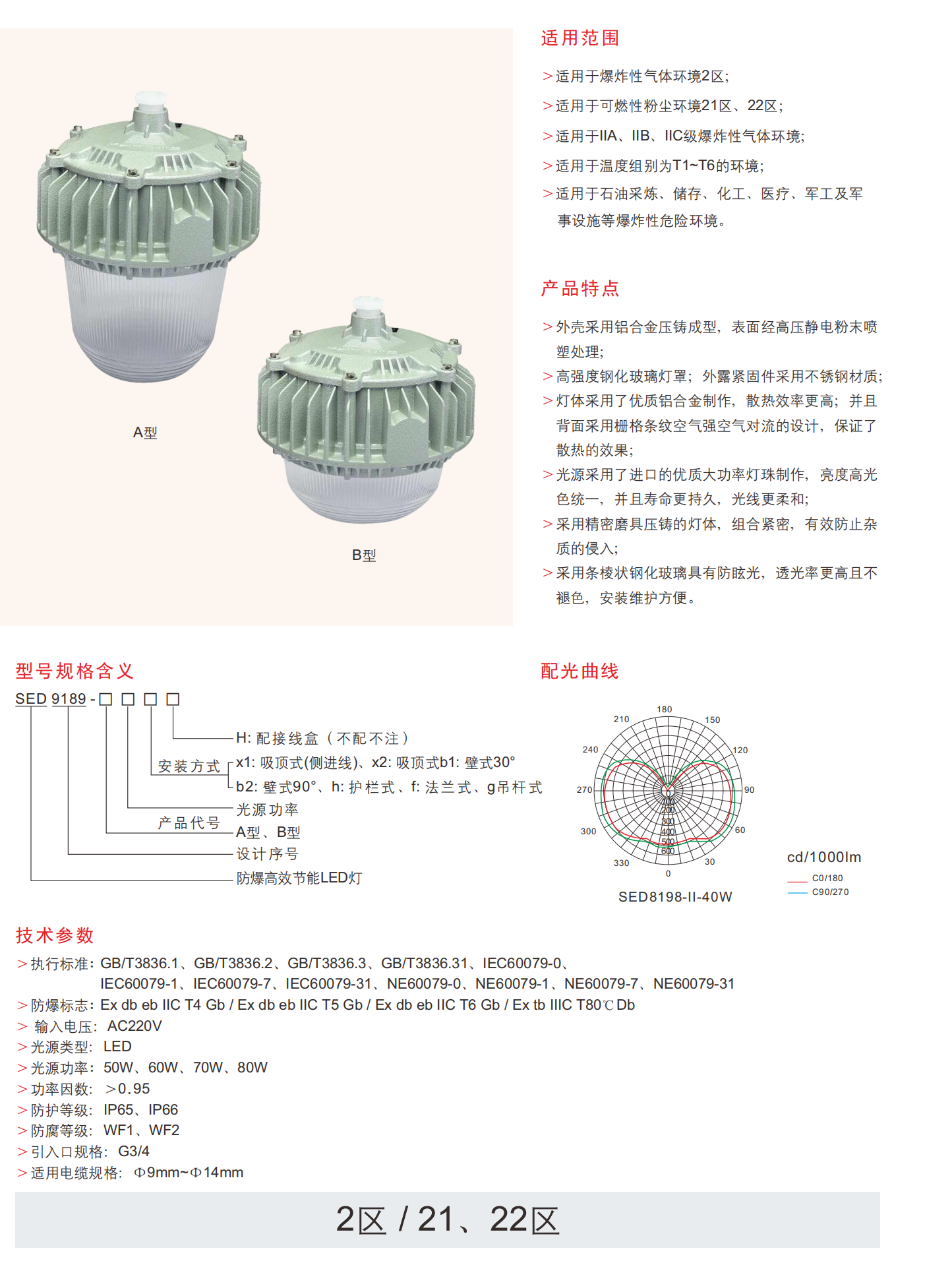 认证区2气体 (iia-iic) 和区21/22粉尘环境,SED9189系列提供超可靠,节能照明 (50W-80W) 为炼油厂,化工厂,和军事设施。采用带防腐粉末涂层的高强度压铸铝合金外壳,其网格优化的热设计可确保50,000小时的稳定运行。钢化玻璃透镜提供无眩光照明 (≥ 140 lm/W),光分布均匀,暗点为零。兼容多种安装选项 (天花板,墙壁,吊坠,法兰) 和G3/4导管入口,符合IP66/WF2保护和全球标准 (GB,IEC,NE)。