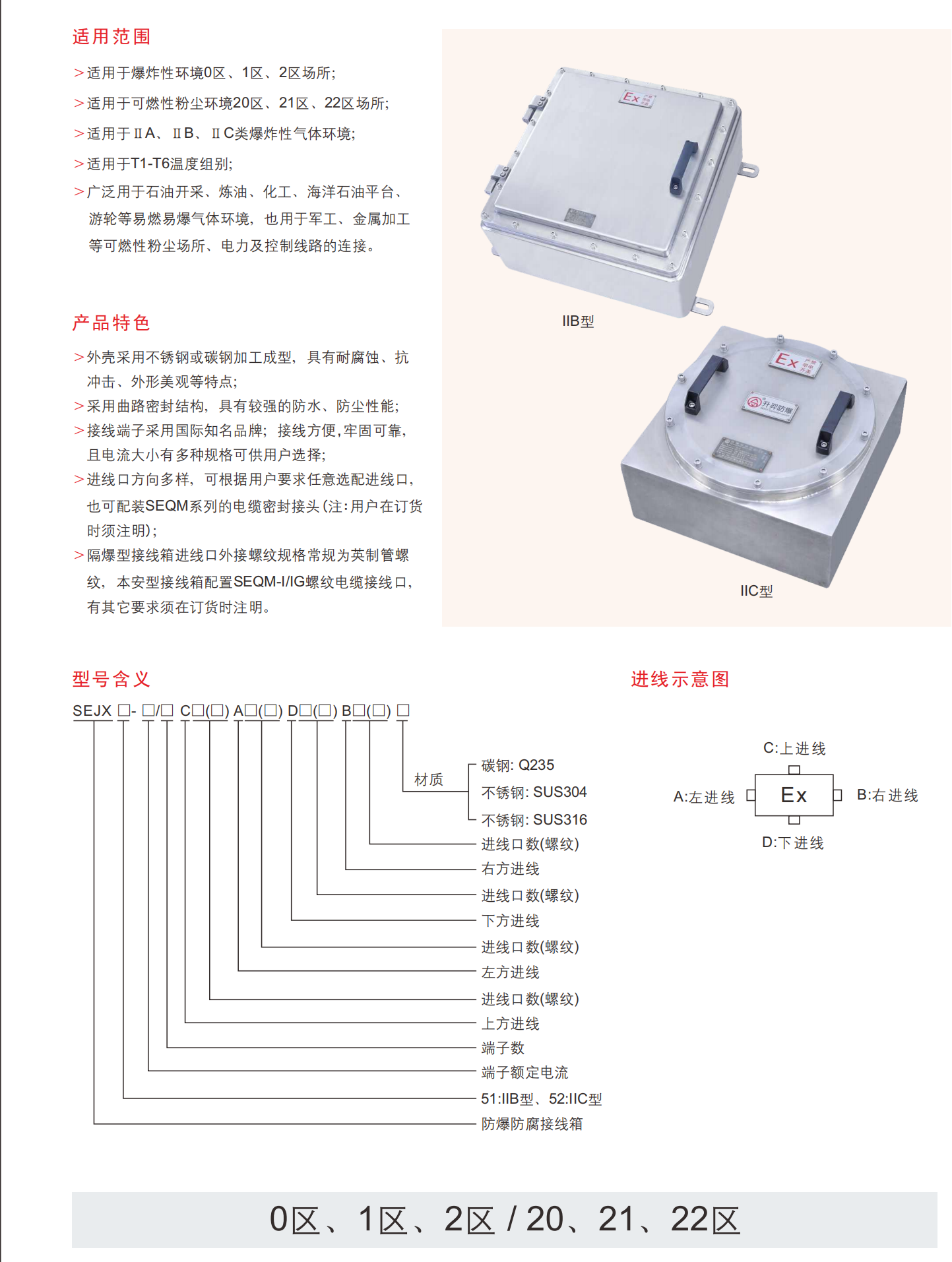 SEJX系列专为0/1/2区气体和20/21/22区粉尘环境而设计,提供不锈钢/碳钢结构,具有卓越的耐腐蚀性,非常适合炼油厂,化工厂,和海洋平台。具有IP65-IP67保护和WF2防腐等级,确保在极端T1-T6条件下的安全。