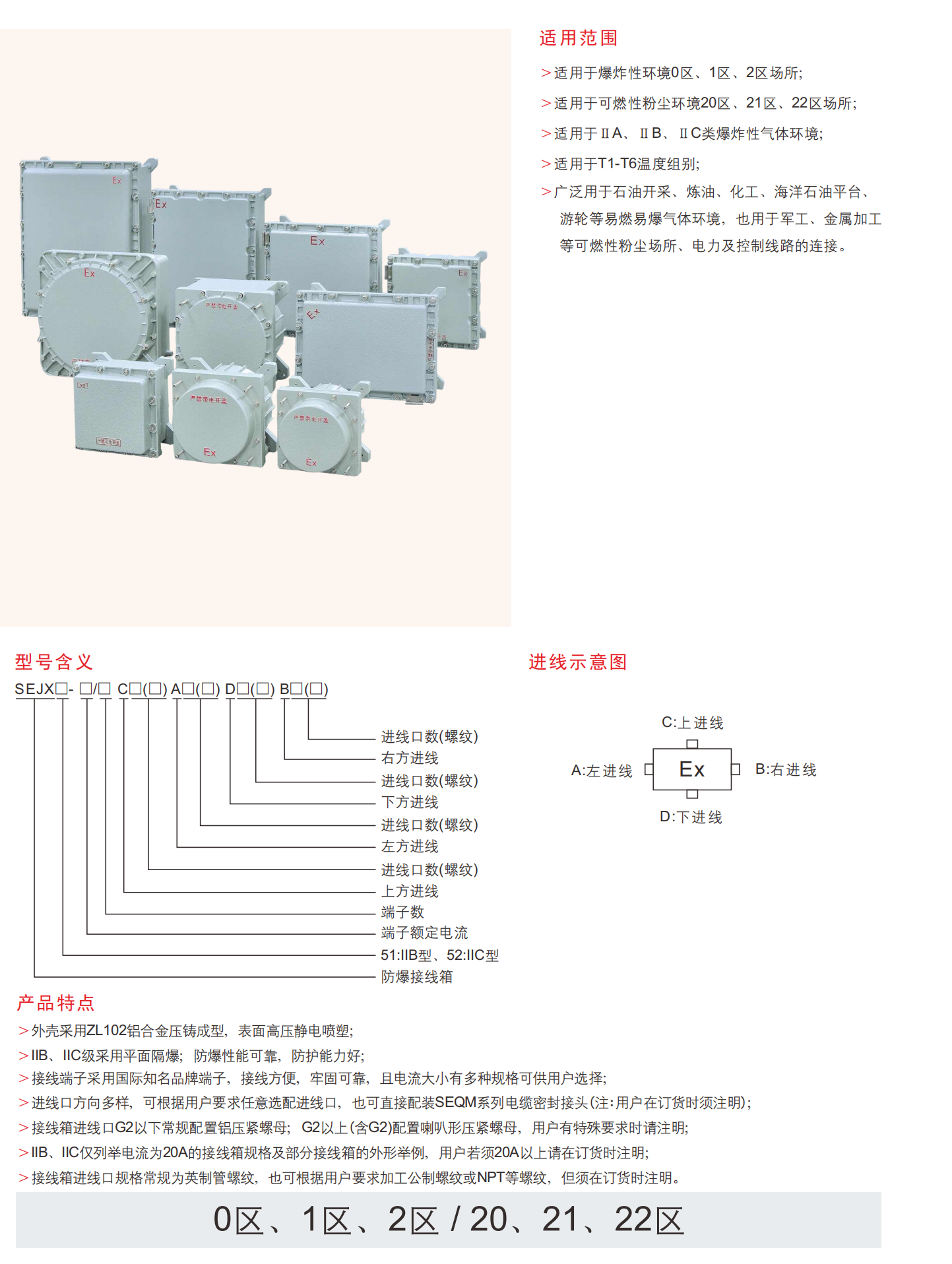 SEJX系列防爆接线盒为连接和保护区域0、1、2 (气体) 和20、21、22 (粉尘) 中的电线提供了安全且适应性强的解决方案危险场所。其可定制的设计允许各种电缆入口配置和终端布置,确保在潜在爆炸性环境中安全可靠的连接。SEJX防爆接线盒专为苛刻的工业环境而设计,采用耐用的压铸ZL102铝合金外壳,带有高压静电粉末涂层。提供多种电缆入口选项 (顶部,底部,左侧,右侧),以适应不同的布线需求。