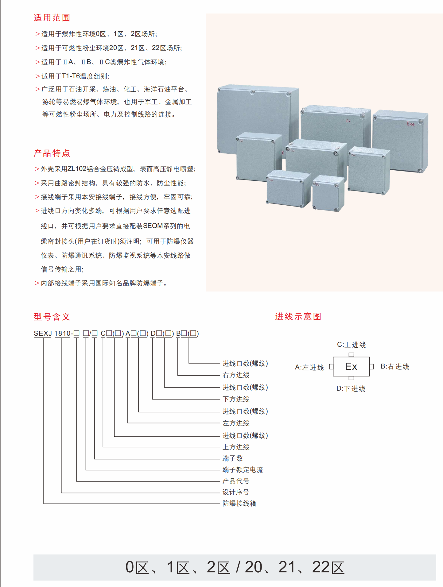 专为爆炸性气体环境 (0区、1区、2区) 和可燃粉尘环境 (20区、21区、22区) 设计,适用于石油、化工、军工等高风险场景。采用ZL102铝合金压铸外壳,结合高压静电粉末喷涂工艺,耐腐蚀性和耐磨性显著增强,满足海上平台和炼油厂等恶劣环境的需求。高防护等级: IP65/IP66/IP67防护 (根据要求定制),密封结构确保防水,防尘和防爆性能 (Ex ia/eb/tb认证)。