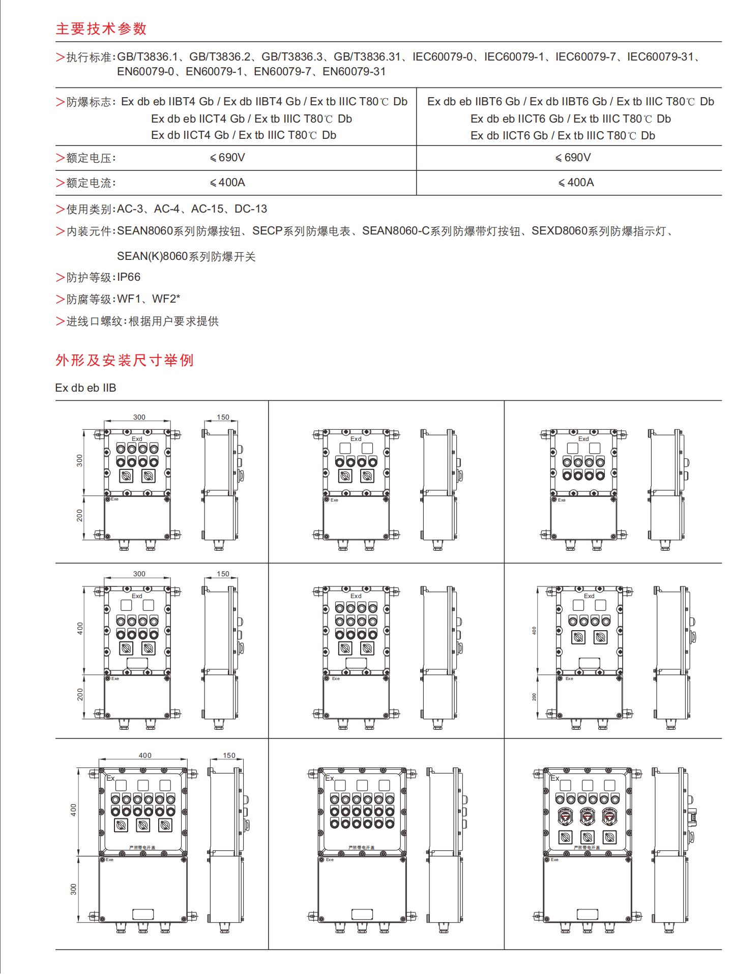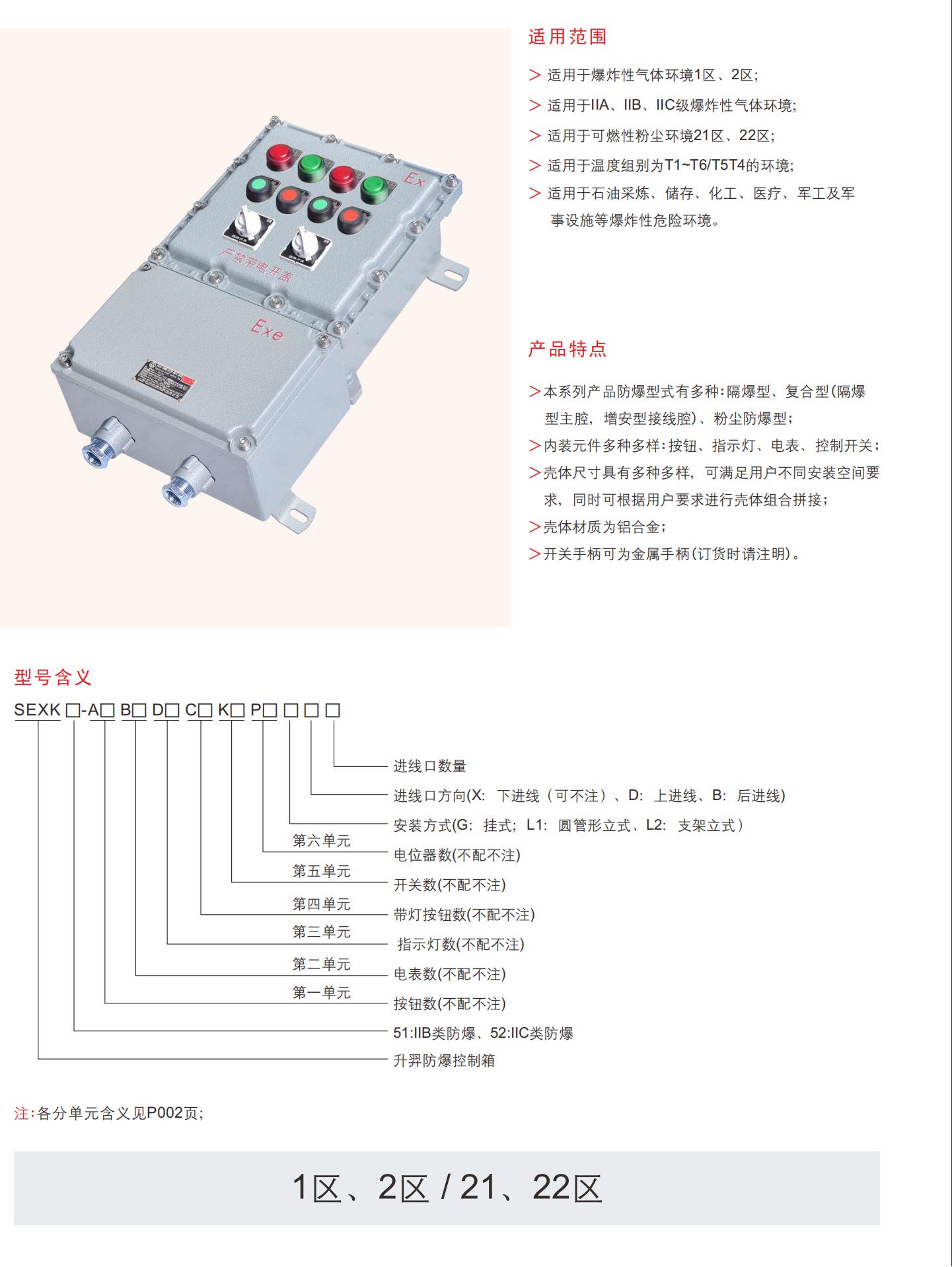 专为1/2区气体 (IIA,IIB,IIC) 和21/22区粉尘环境,SEXK系列提供多室安全架构 (隔爆主室增加安全布线区) 隔离炼油厂、化工厂和军事设施的风险。具有IP66/WF1-WF2耐腐蚀性的高强度铝合金外壳,它支持可扩展的配置 (按钮,仪表,开关,指示器) 和可定制的外壳 (可通过联锁单元扩展)。通过Ex db eb IIC T4-T6 Gb/Ex tb IIIC T80 °C Db (GB/IEC/EN) 认证,可处理高达400A (AC/DC) 的高电流负载具有通用兼容性 (AC-3,AC-15,DC-13)。独特的金属手柄选项和螺纹电缆入口 (M20-M32) 确保在极端温度 (-40 °C至55 °C) 下的耐用性。