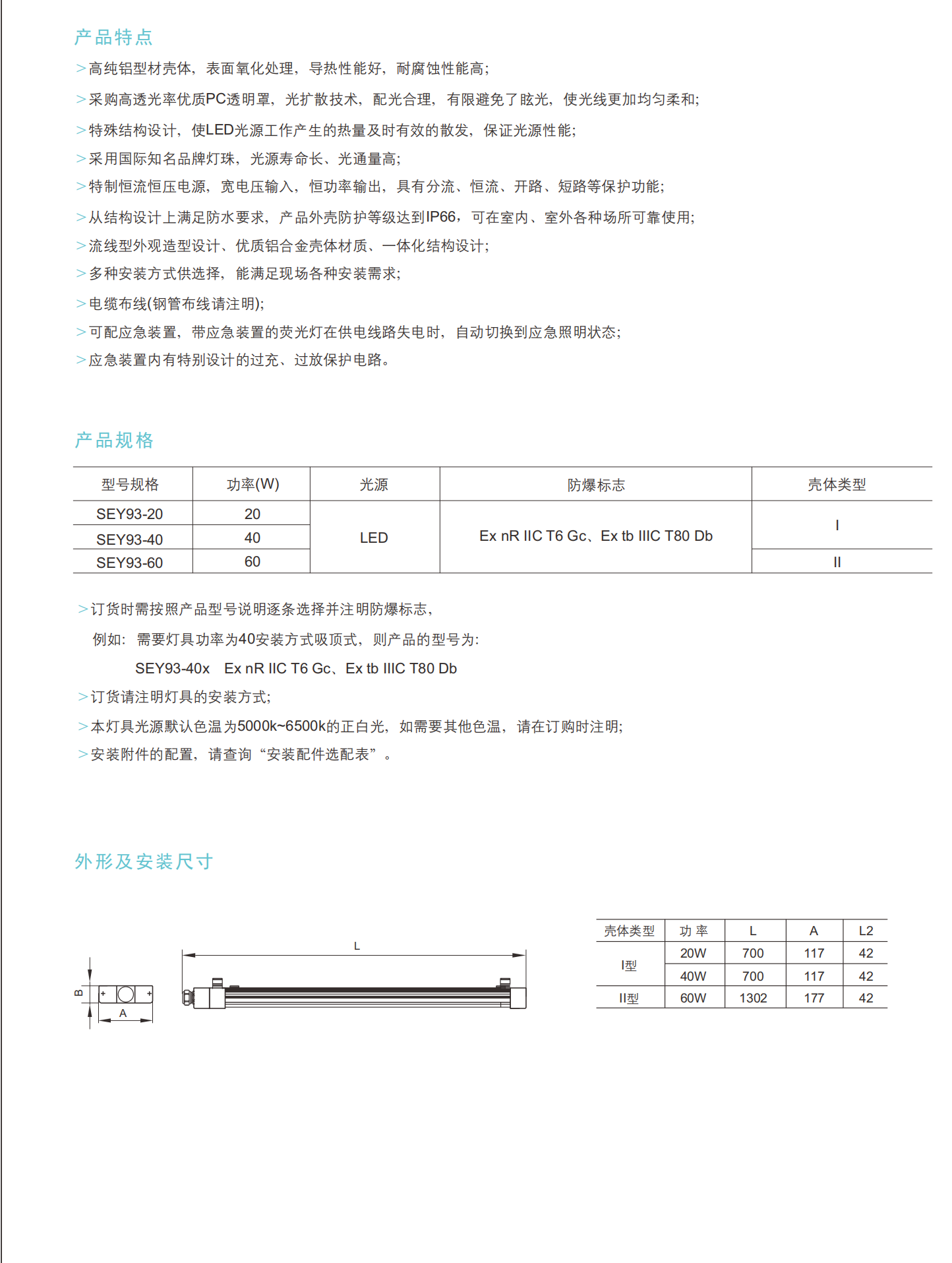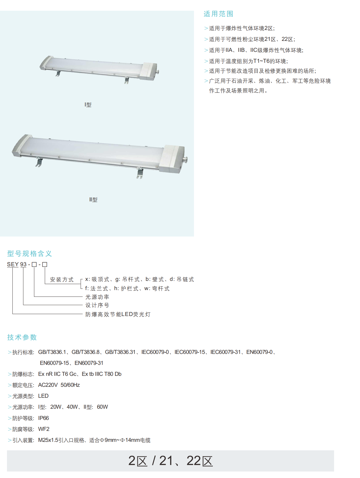 SEY93系列专为2区气体和21/22区粉尘环境设计,为炼油厂、化工厂和军事设施等危险环境提供均匀、无眩光的照明。具有IP66/WF2等级的高纯度铝外壳,它集成了光扩散PC透镜和先进的热管理,以延长LED寿命 (20w/40w/60w选项)。通过Ex nR IIC T6 Gc/Ex tb IIIC T80 Db (GB/IEC/EN) 认证,支持宽电压输入 (AC220V 50/60hz) 以及停电时的无缝紧急切换。可定制的安装 (天花板,吊坠,墙壁) 和可调色温 (5000K-6500K) 确保在T1-T6区域的适应性。